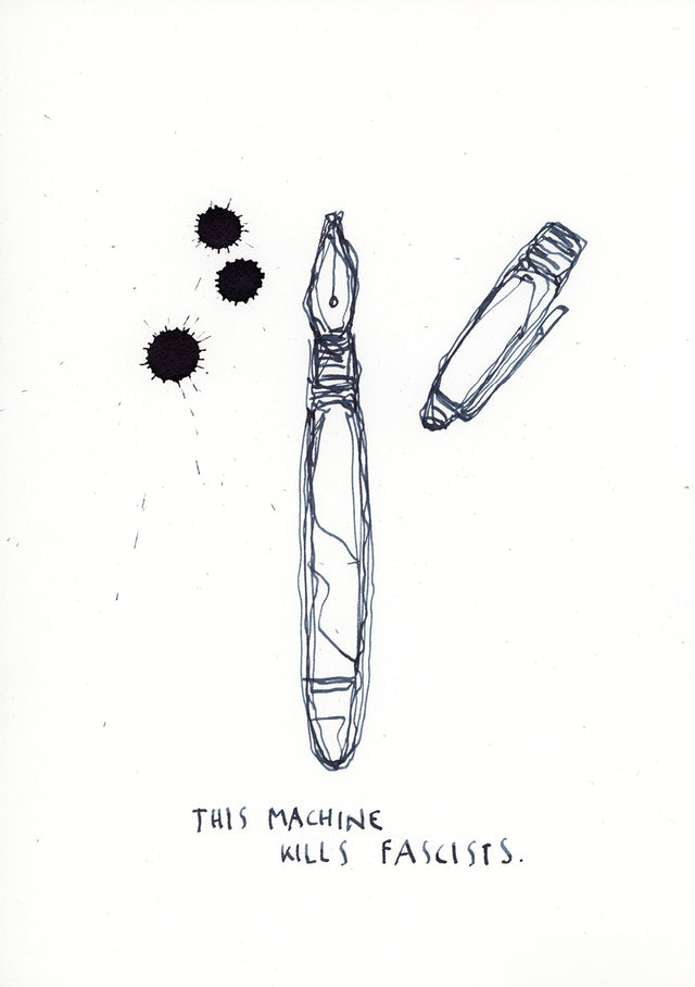 "These drawings represent what comes to my mind: little statements, both drawn and written. Words are important, and all these drawings reflect on our society and the messed-up issues we are confronted with. While not all of them are politically infused, many are very poetic, romantic, melancholic, and smooth, like a 1950s Miles Davis composition. However, most are edgy and often uncomfortable, reminiscent of Mingus or Coleman. When they go off the rails, the soundtrack shifts to Mr. Bungle, Mike Patton, Tomahawk, the Melvins, or much of John Zorn‘s work. Because you know, in my opinion, a good drawing should always strive to be like a great song."
