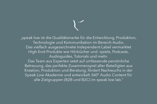 Den Berliner Hörbuchverlag speak low durften wir bei Neupositionierung und Rebranding begleiten. Gern geschehen! Die Entwicklung und Produktion von Audioformaten ist schließlich auch ein Teil unserer DNA, deshalb darf man die Zusammenarbeit durchaus als eine Win-Win-Situation verstehen. Echte Audio-Perlen, auf höchstem Qualitätslevel produziert und jetzt auch „State-of-the-Art“ präsentiert.