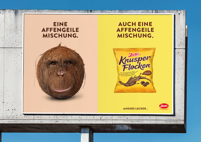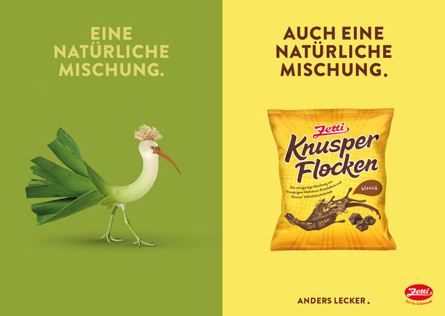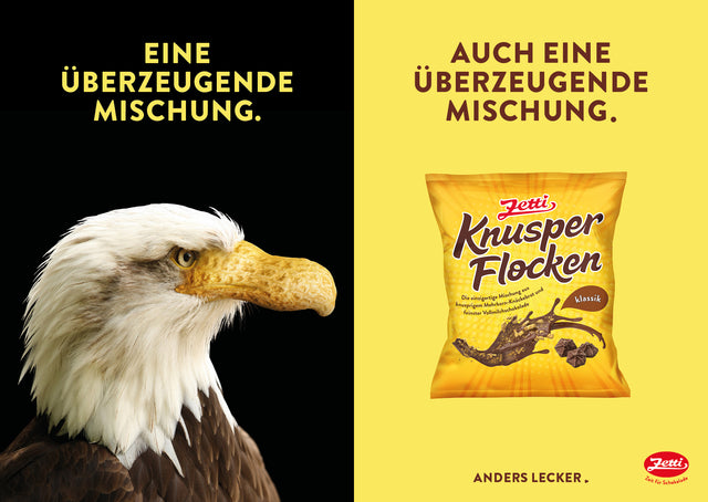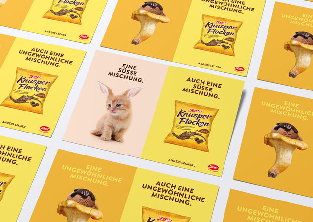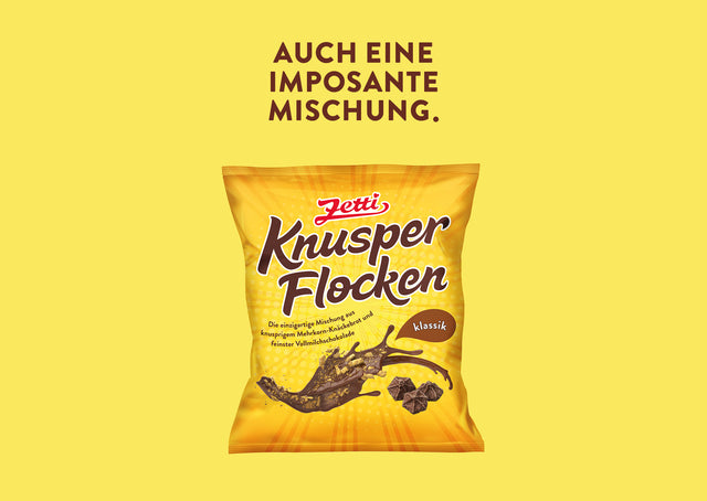 Knusperflocken sind eine einzigartige Mischung. So steht's schon auf dem Beutel geschrieben. Und um einzigartige Mischungen geht's auch in der aktuellen Kampagne für unseren Kunden Zetti und sein Kultprodukt mit der großen Fangemeinde. Und nicht nur die Flocken haben ihre Fans. Für die Motive gilt das schon genauso.